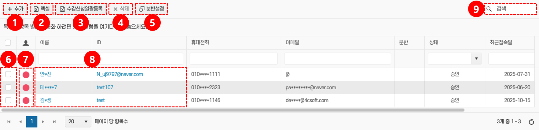 • 체크박스: 여러 학습자를 동시에 선택할 때 체크박스⑥ 를 클릭한다.