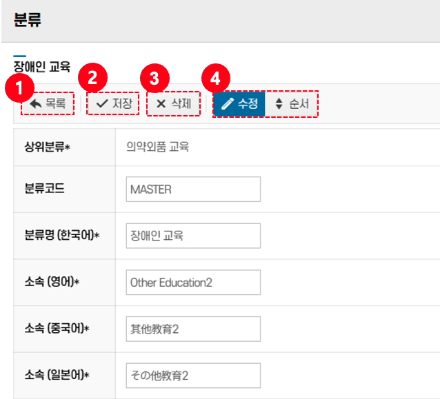 • 수정: 분류 항목을 편집하려면 수정 버튼④ 클릭 → 수정 가능 상태로 전환 후 원하는 내용을 변경한다.