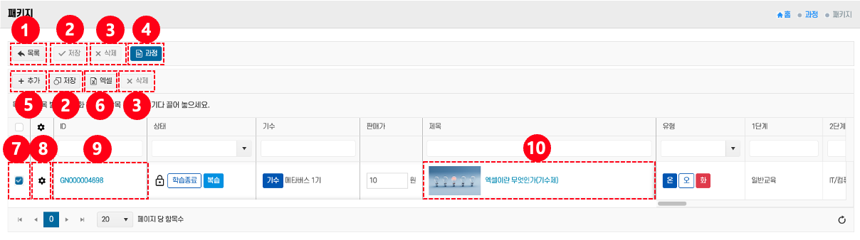 - 과정명 확인/수정: 과정을 확인하거나 편집하려면 제목 ⑩ 클릭 → 상세 화면에서 수정 후 저장한다.