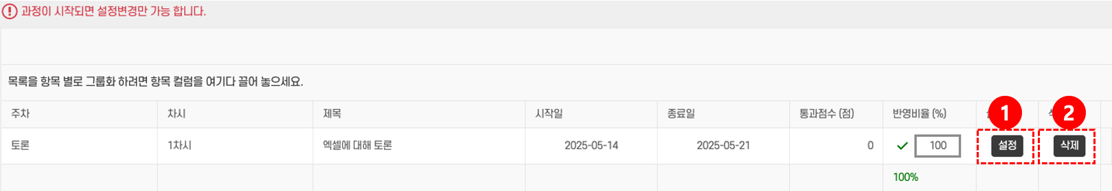 - 삭제: 불필요한 토론 항목은 삭제 버튼② 을 클릭하고 확인 창에서 ‘확인’을 선택한다.