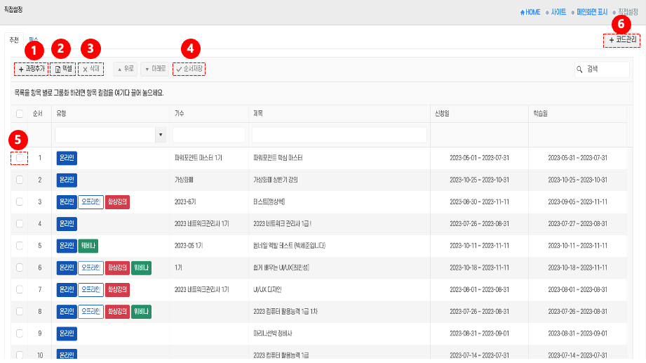 과정추가: 상단의 과정추가 버튼 ①을 클릭 → 새로운 추천 과정을 등록한다.