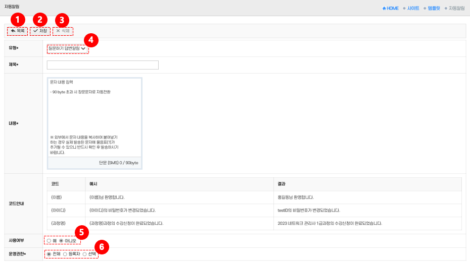 • 저장: 상단의 저장 버튼 ⑤를 클릭 → 신규 문자를 등록한다.