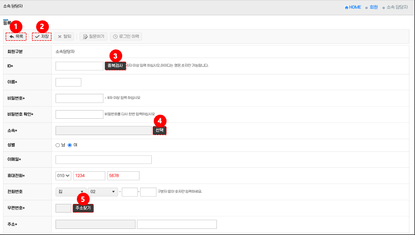 목록 이동: 상단의 목록 버튼 ⑤을 클릭 → 소속담당자 목록으로 이동한다.