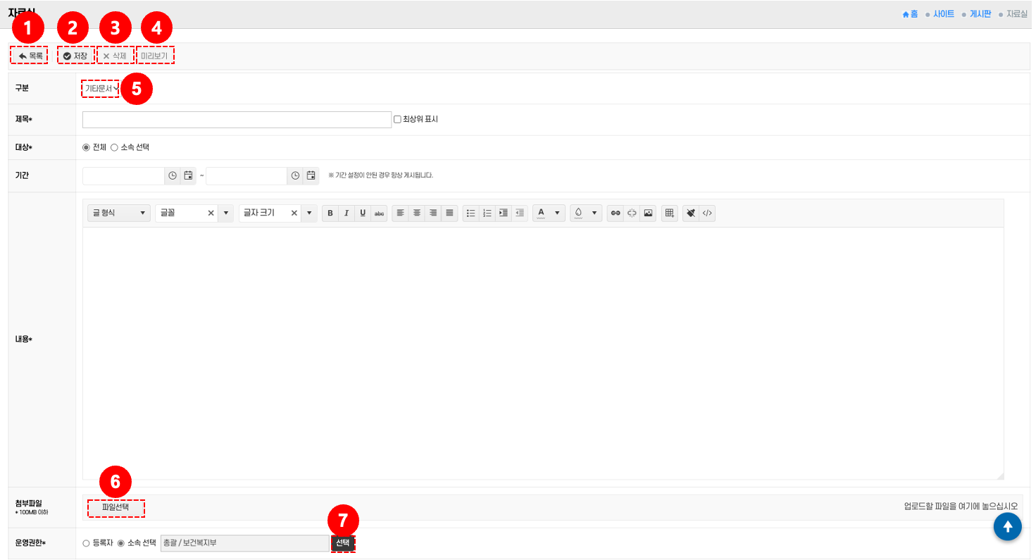저장: 상단의 저장 버튼 ⑤을 클릭 → 자료를 등록한다.