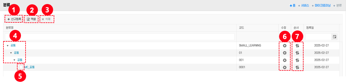 • 수정: 대상 행의 톱니바퀴⑦ 클릭 → 상세 화면에서 분류명, 코드, 상위 분류 수정 후 저장한다.