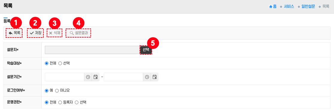 - 저장: 설문지명, 학습대상, 기간 등을 입력 후 저장 버튼② 클릭 → 신규 설문이 등록된다.
