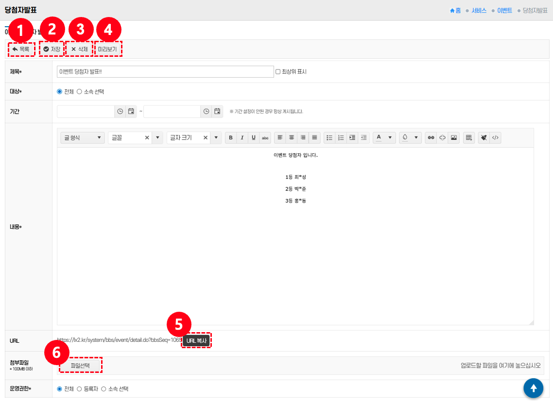 - 삭제: 삭제 버튼 ③ 클릭 → 현재 작성 중인 당첨자 발표 글이 삭제된다.
