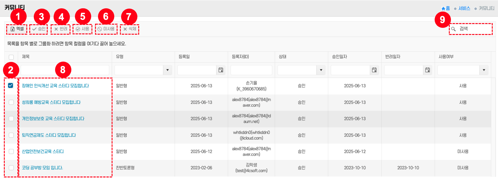 - 승인: 승인할 글을 체크박스 ②로 선택 → 승인 버튼 ③ 클릭 → 승인 상태로 전환된다.