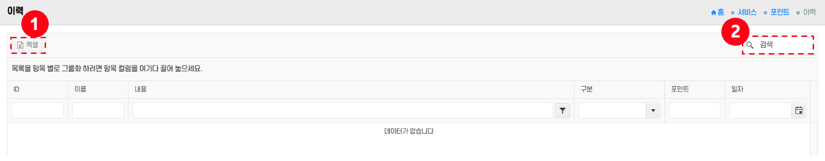 - 엑셀 다운로드: 상단의 엑셀 버튼① 클릭 → 현재 화면의 포인트 이력이 엑셀 파일로 저장된다.
