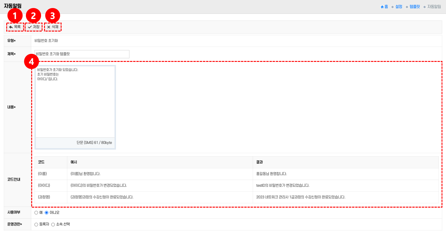 - 삭제: 불필요한 자동알림을 제거하려면 삭제 버튼 ③ 클릭 → 해당 항목이 삭제된다.