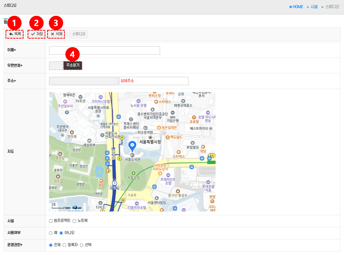 • 저장: 상단의 저장 버튼 ②을 클릭 → 입력한 스튜디오 정보를 저장한다.