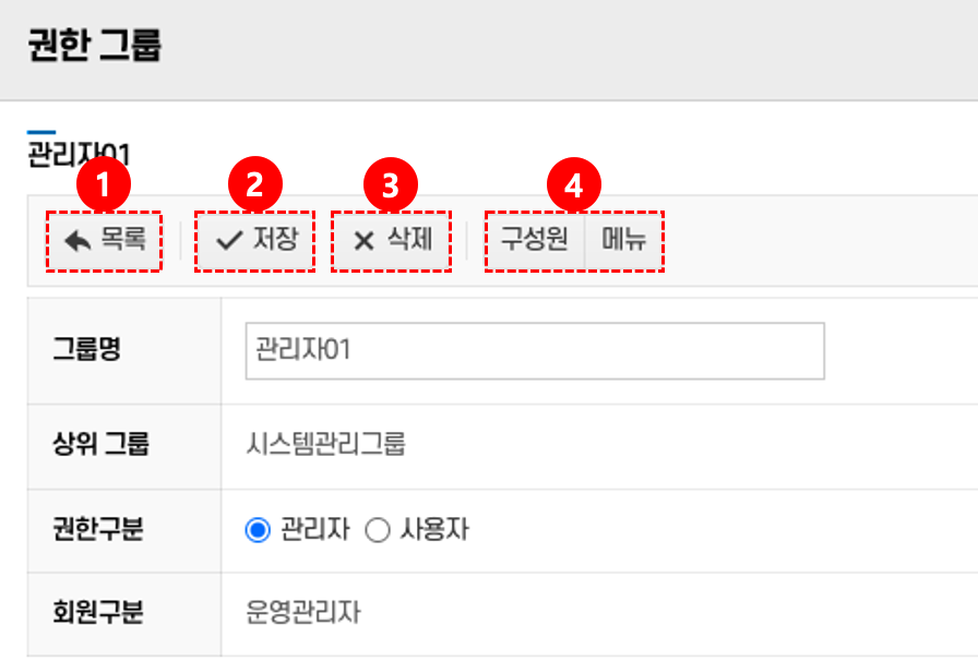 - 저장: 그룹명과 권한구분을 입력 후 저장 버튼 ②를 클릭 → 입력된 내용이 저장된다.