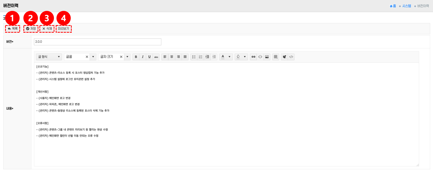 • 삭제: 잘못 등록한 항목을 제거하려면 삭제 버튼 ③을 클릭 → 해당 버전 이력이 삭제된다.