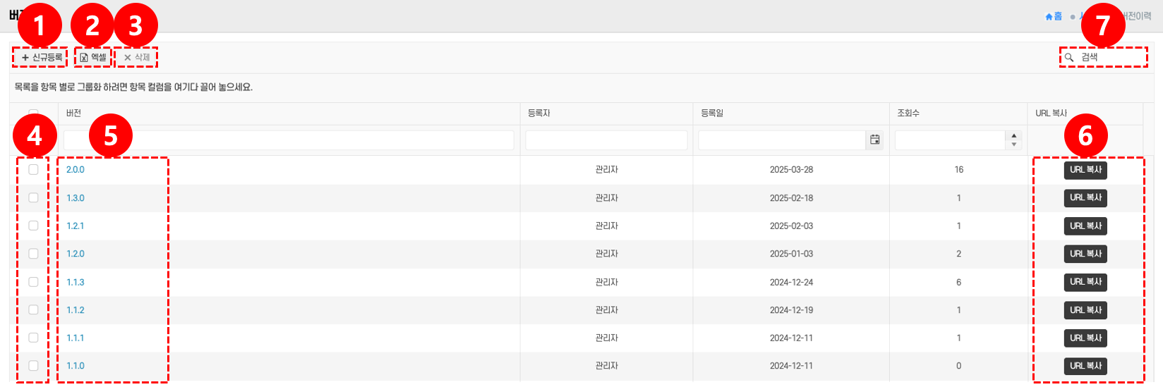 - 상세: 등록된 버전 항목 ⑤을 클릭 → 세부 내역 확인 및 관리 화면으로 이동한다.
