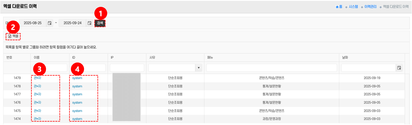 - ID 확인: 목록에서 ID 영역 ④을 통해 엑셀 다운로드 실행자의 계정을 확인한다.
