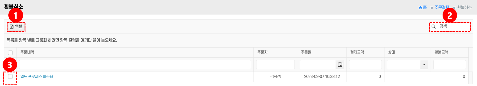 검색: 상단의 검색창 ②에 조건 입력 → 주문내역, 주문자, 주문일 등 원하는 기준으로 환불취소 내역을 조회한다.