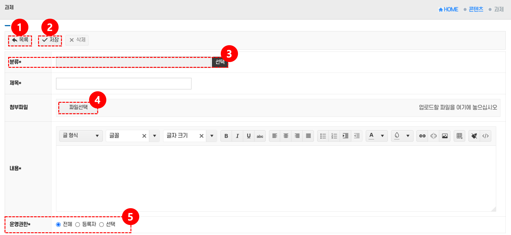 - 운영권한 설정: 과제 접근 권한을 부여하려면 운영권한 ⑤ 옵션에서 전체, 등록자, 선택 중 지정한다.