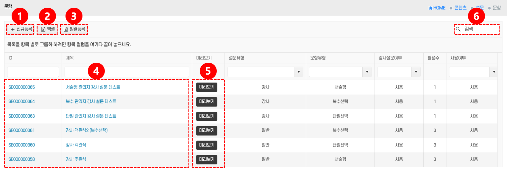 - 검색: 원하는 문항을 찾으려면 검색창 ⑥에 키워드를 입력하고 조회한다.