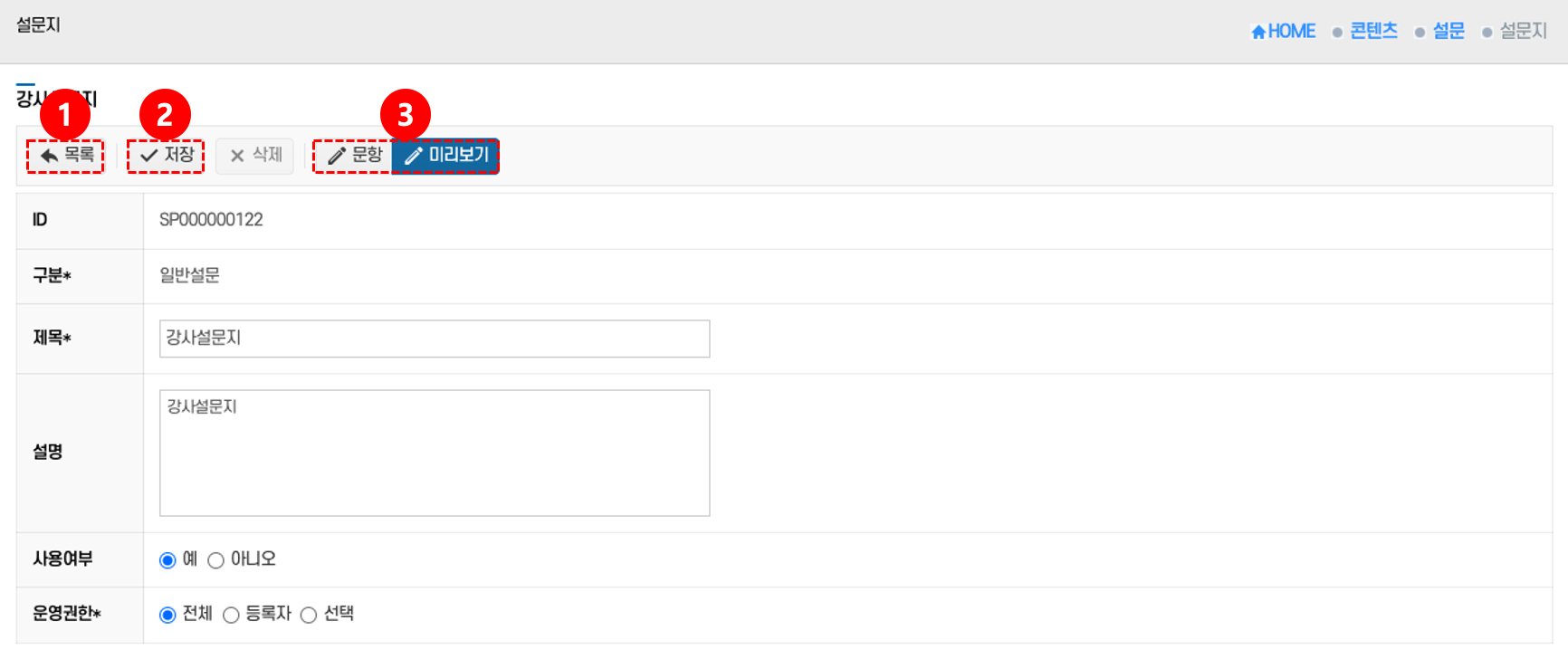 - 저장: 입력한 설문지 정보를 저장하려면 저장 버튼 ②를 클릭한다.