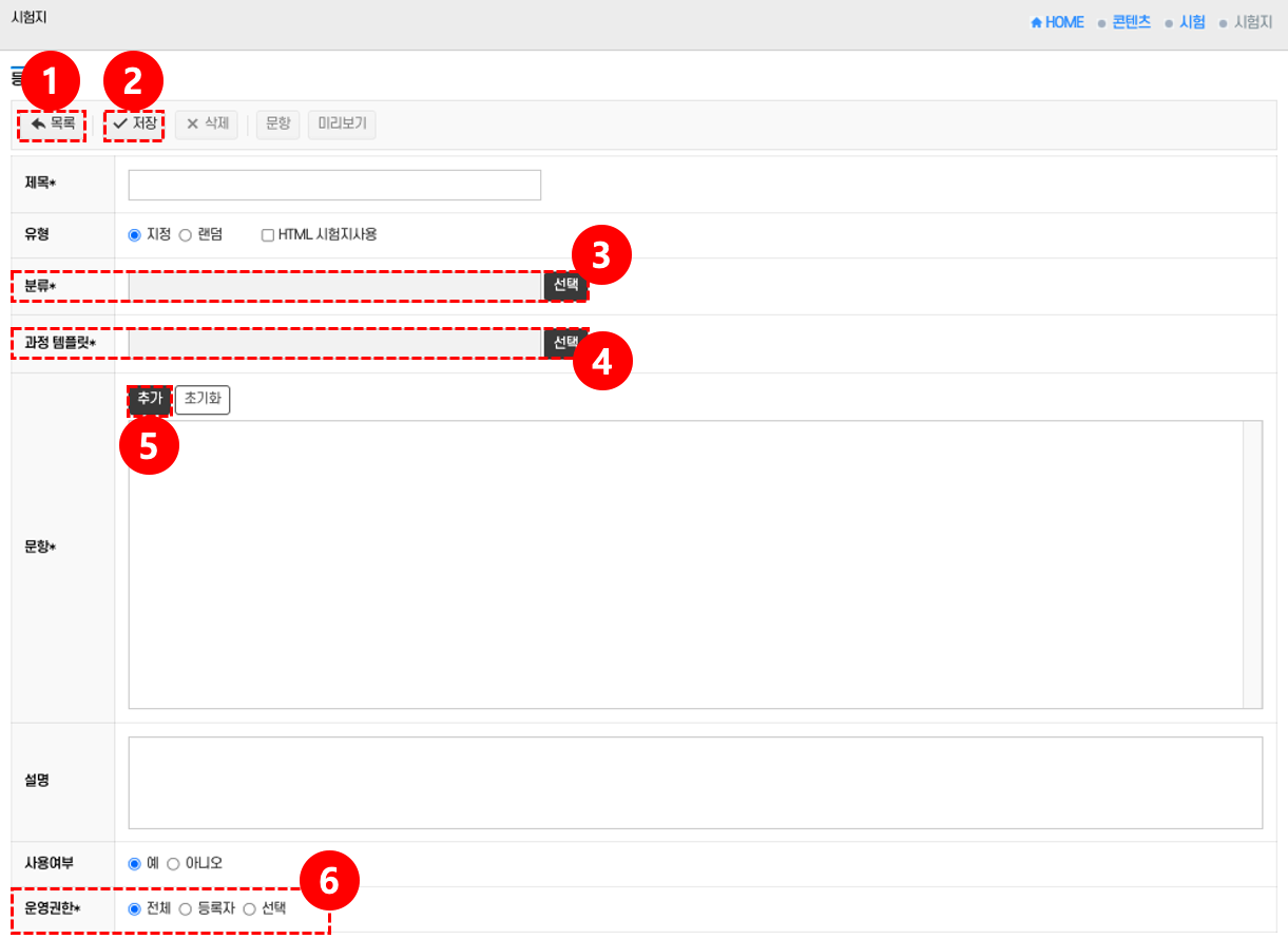 • 저장: 시험 제목, 분류, 과정 템플릿 등 필수 항목 입력 후 저장 버튼 ②을 클릭하면 시험지가 등록된다.