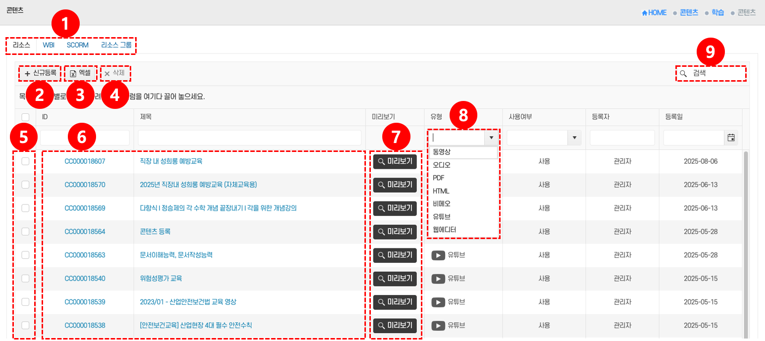 - 리소스, WBI, SCORM, 리소스 그룹 등 콘텐츠 유형을 구분할 수 있다.