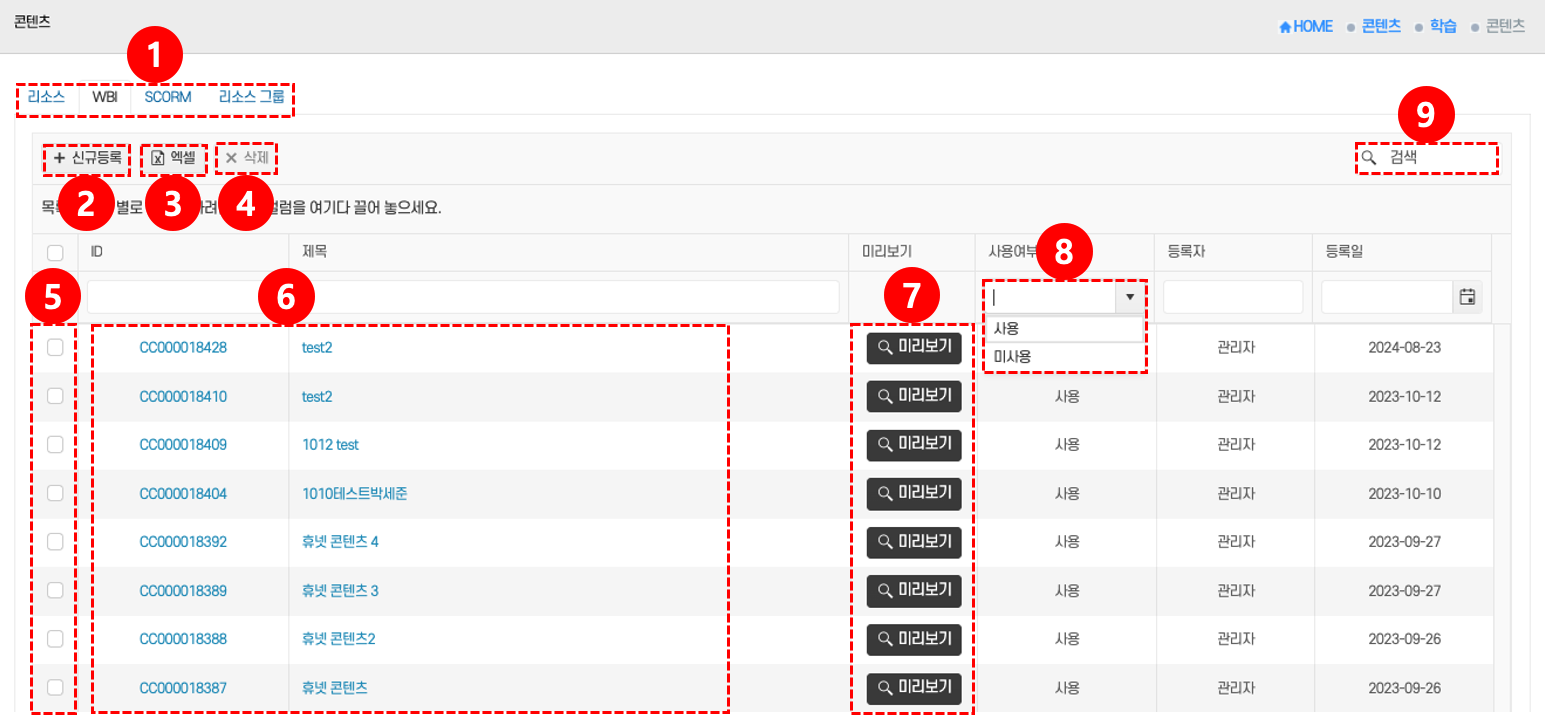 • 탭: 리소스, WBI, SCORM, 리소스 그룹