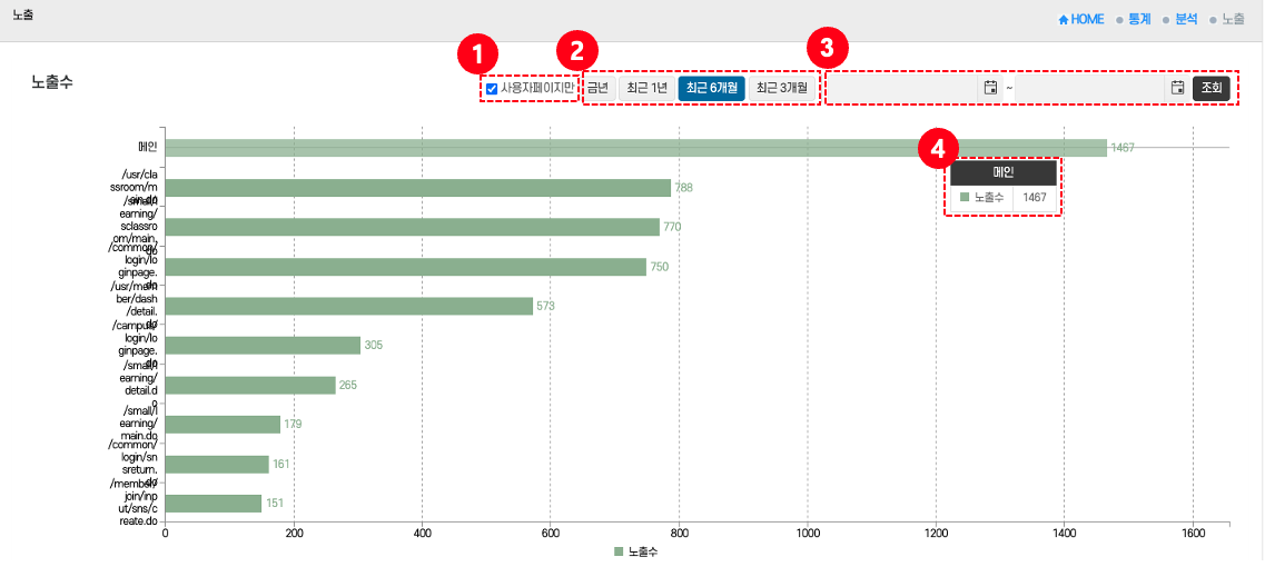 - 상세 데이터: 그래프의 막대에 마우스를 올리면 해당 페이지의 노출수가 팝업으로 표시된다.