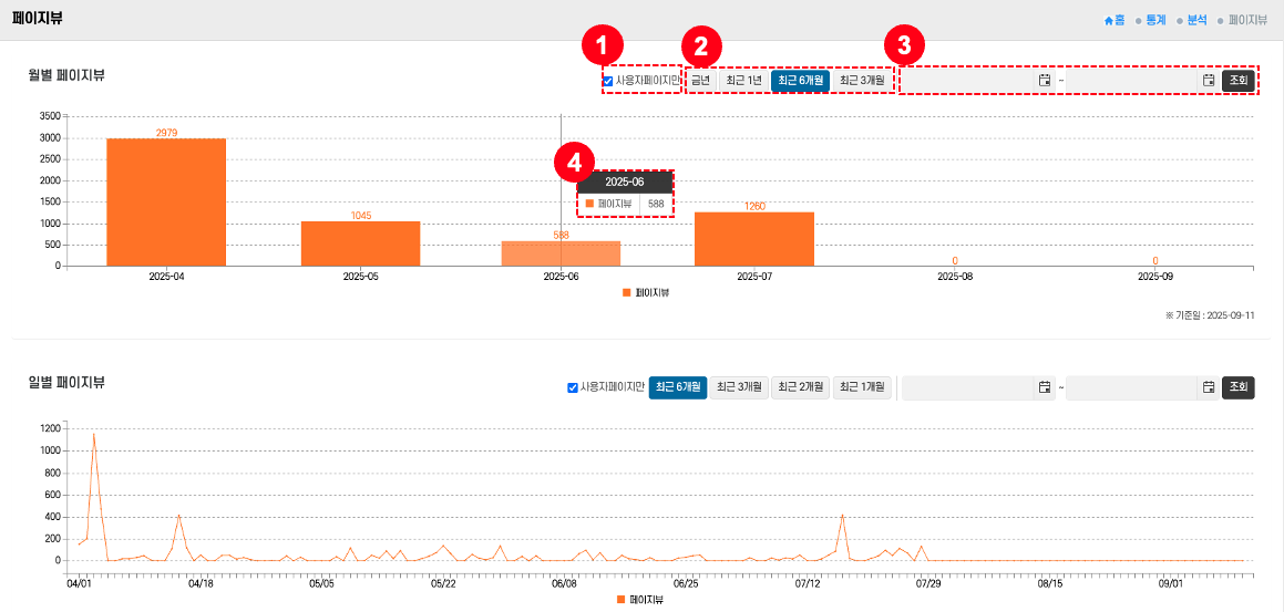 - 기간 선택: 상단의 금년/최근 1년/최근 6개월/최근 3개월 버튼 ② 클릭 → 차트에 해당 기간 페이지뷰 데이터가 반영된다.