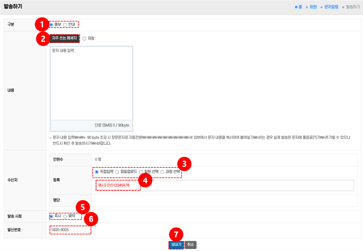 발송하기: 하단의 발송 버튼 ⑦을 클릭 → 문자를 발송한다.