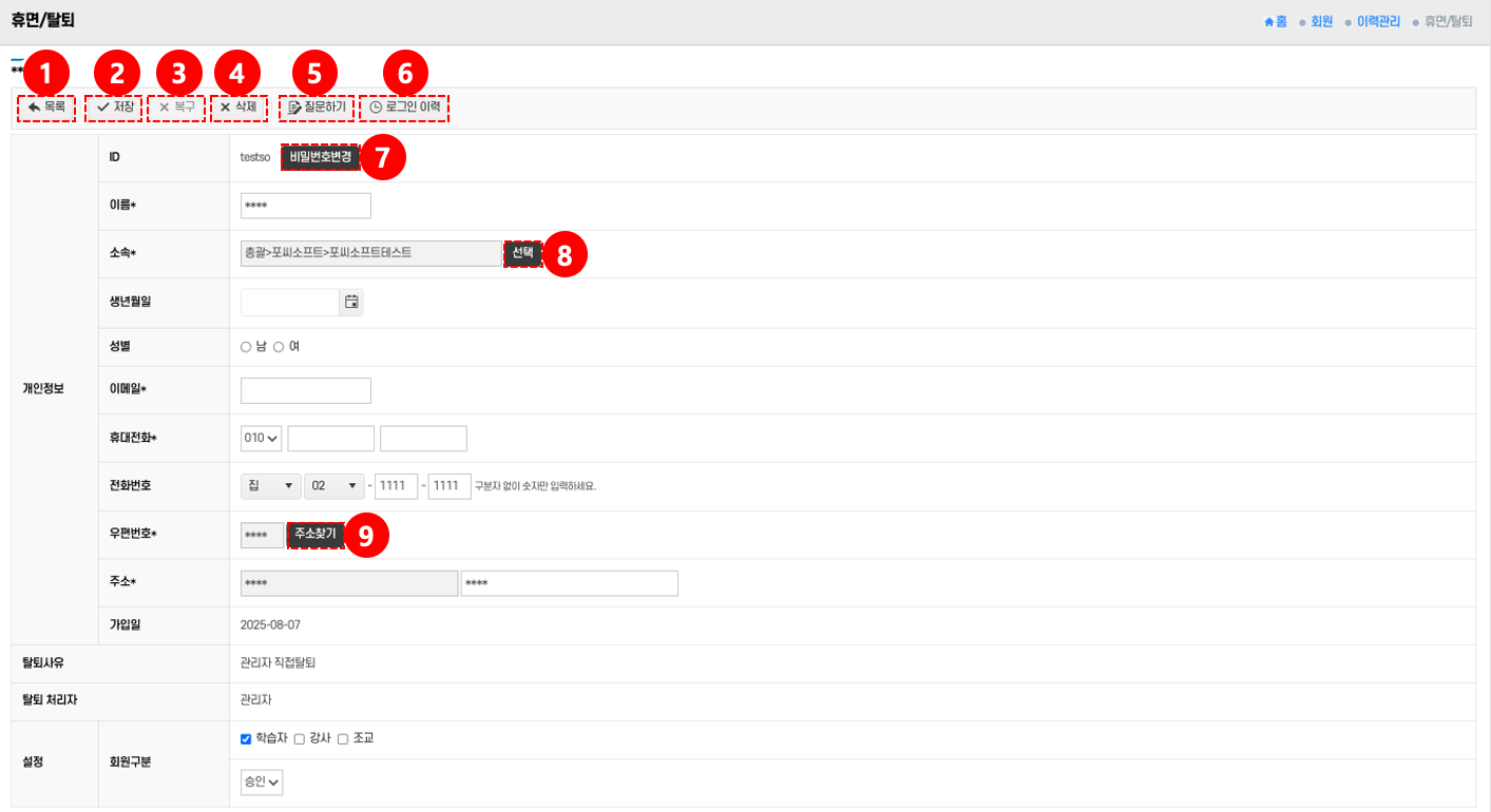 • 로그인 이력 확인: 로그인 이력 버튼 ⑥ 클릭 → 회원의 접속 기록을 조회한다.