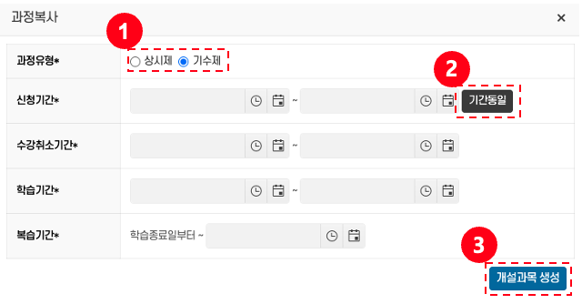 - 과정유형 지정: 과정 복사 화면에서 과정유형 선택 ① → 상시제 또는 기수제 선택한다.