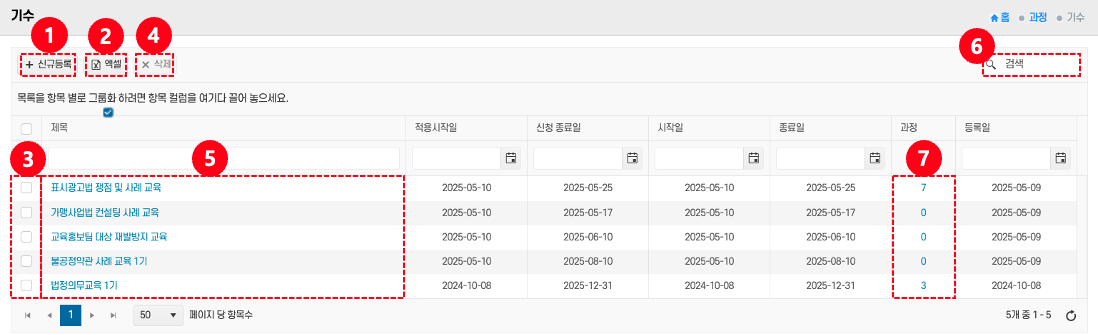 - 제목: 기수명을 확인하려면 제목 ⑤ 클릭 → 상세 화면에서 과정, 강사, 수강 인원 등을 확인·수정한다.