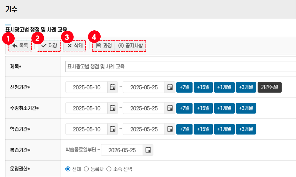• 저장: 기수 제목, 신청·취소·학습 기간, 운영권한 등을 입력/수정 후 저장 버튼② 클릭 → 변경 내용이 반영된다.