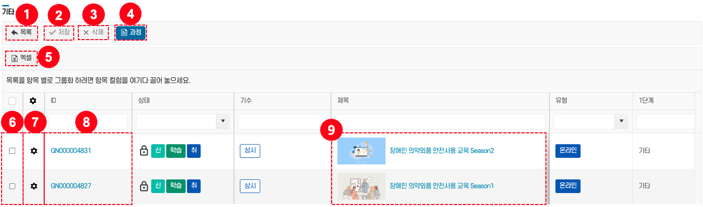 - 목록: 목록 버튼 ① 클릭 → 기타 과정 전체 목록 화면으로 이동한다.