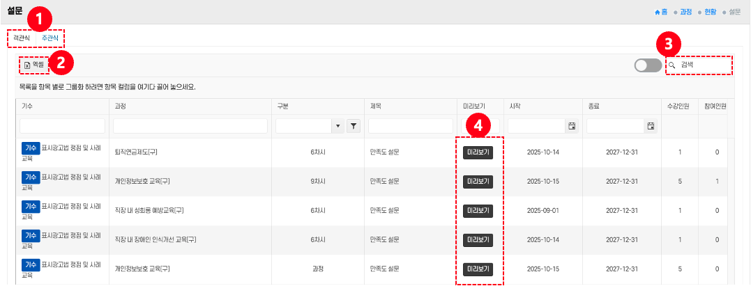 - 탭: 설문 유형을 확인하려면 탭 버튼 ① 클릭 → 객관식/주관식 설문 목록이 전환된다.