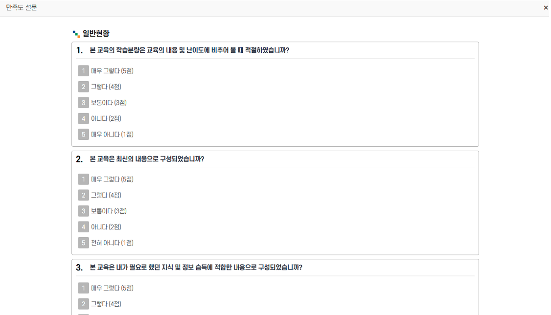 • 교육의 적절성, 최신성, 필요성 등을 객관식 문항으로 확인할 수 있다.