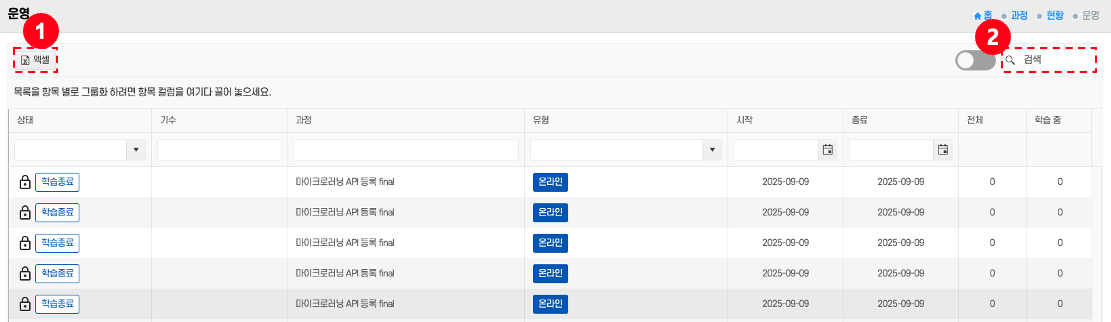 - 학습자 상태, 과정명, 유형, 시작·종료일 등의 정보를 포함해 관리할 수 있다.