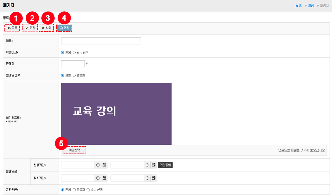 - 저장: 패키지 제목, 학습대상, 판매가, 이미지 등을 입력 후 저장 버튼② 클릭 → 신규 패키지가 등록된다.