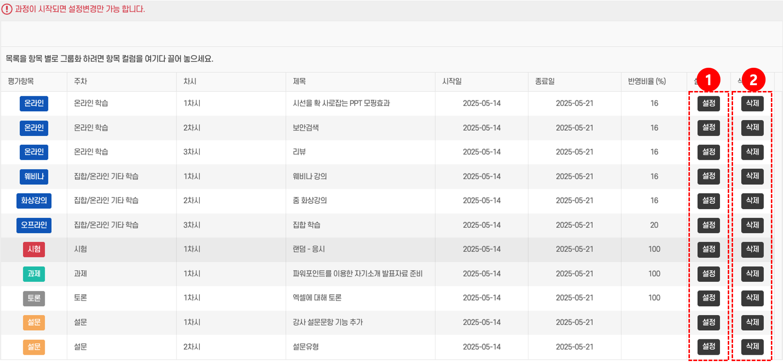 - 온라인 학습, 시험, 과제 등 항목별로 반영비율과 기간 등을 관리한다.