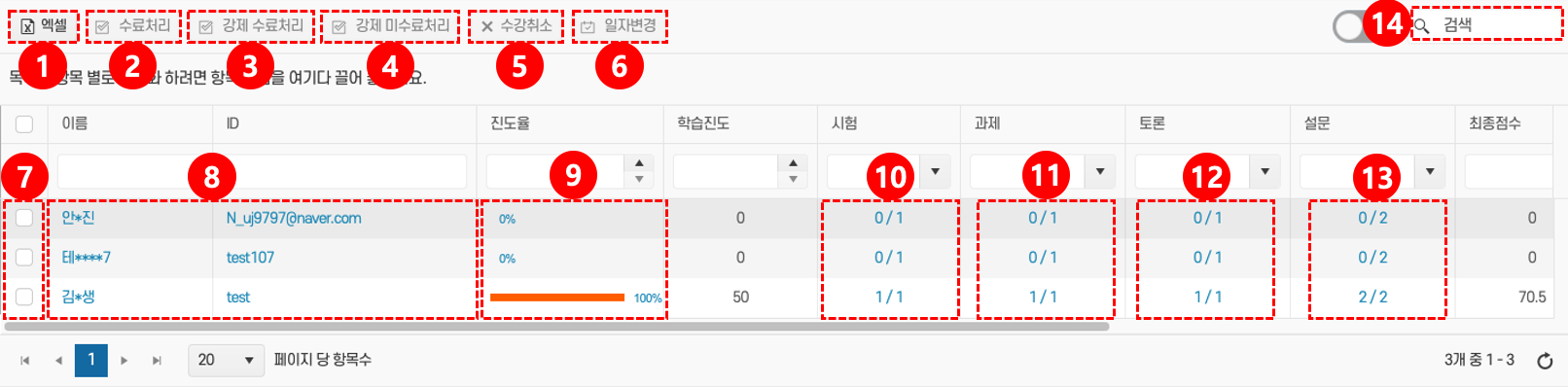 - 검색: 특정 학습자를 찾으려면 검색창⑭ 에 이름 또는 ID를 입력해 조회한다.