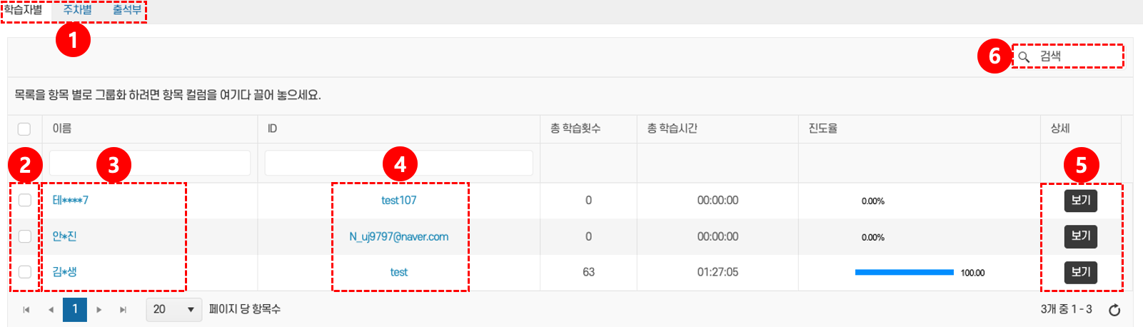 - 검색: 특정 학습자를 조회하려면 검색창⑥ 에 이름 또는 ID를 입력해 검색한다.