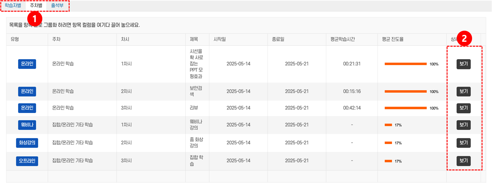 • 보기: 각 차시의 세부 데이터를 확인하려면 보기 버튼② 을 클릭해 학습시간과 진도율을 확인한다.