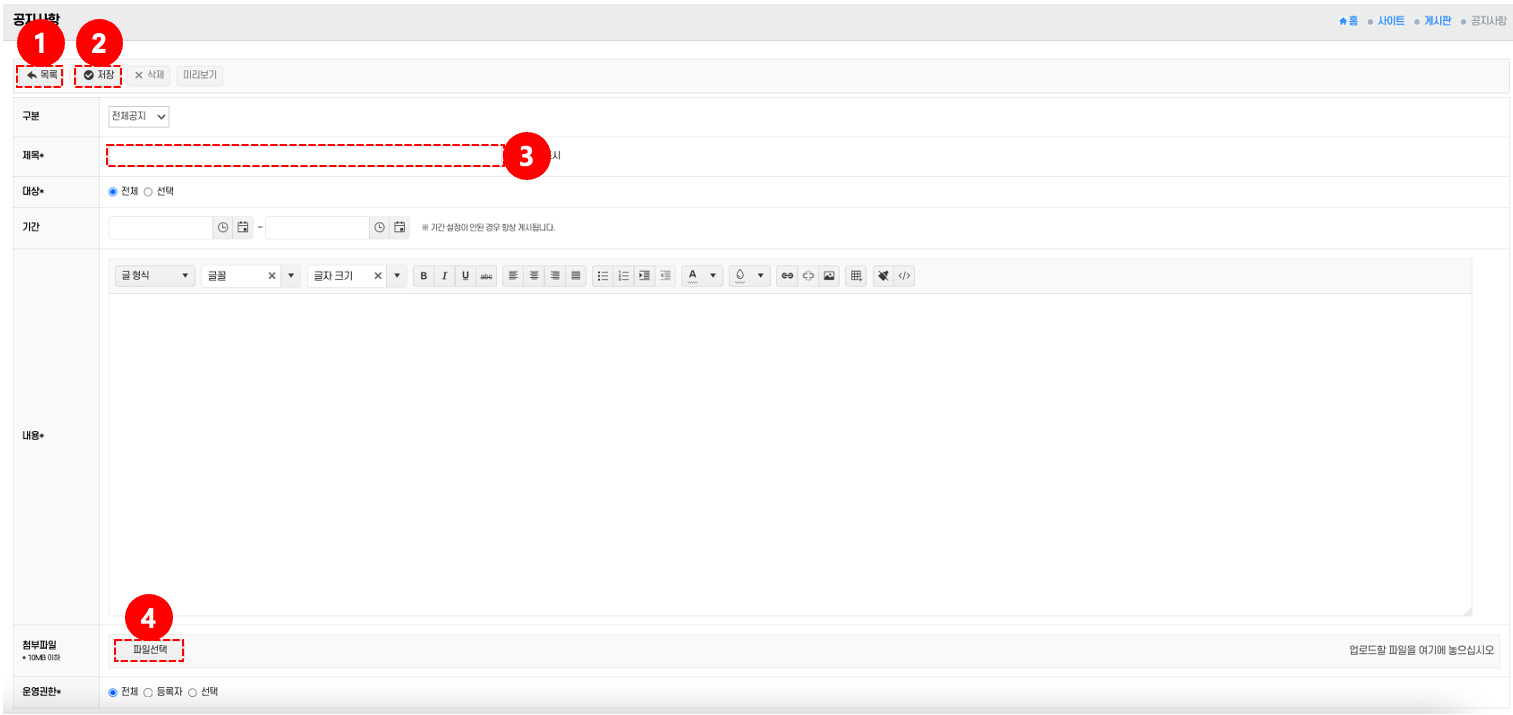 제목/내용 입력: 제목 입력란 ②과 내용 입력란에 작성 → 필요 시 최상위 표시를 체크한다.