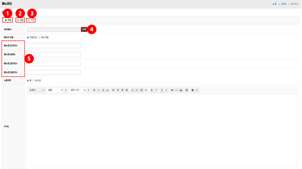 • 메뉴명 입력: 메뉴명 입력란 ⑤에 등록할 메뉴명을 작성한다.