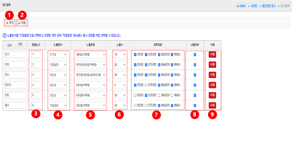 • 노출방식 선택: 노출방식 옵션 ⑤을 선택 → 표시 방식을 지정한다.