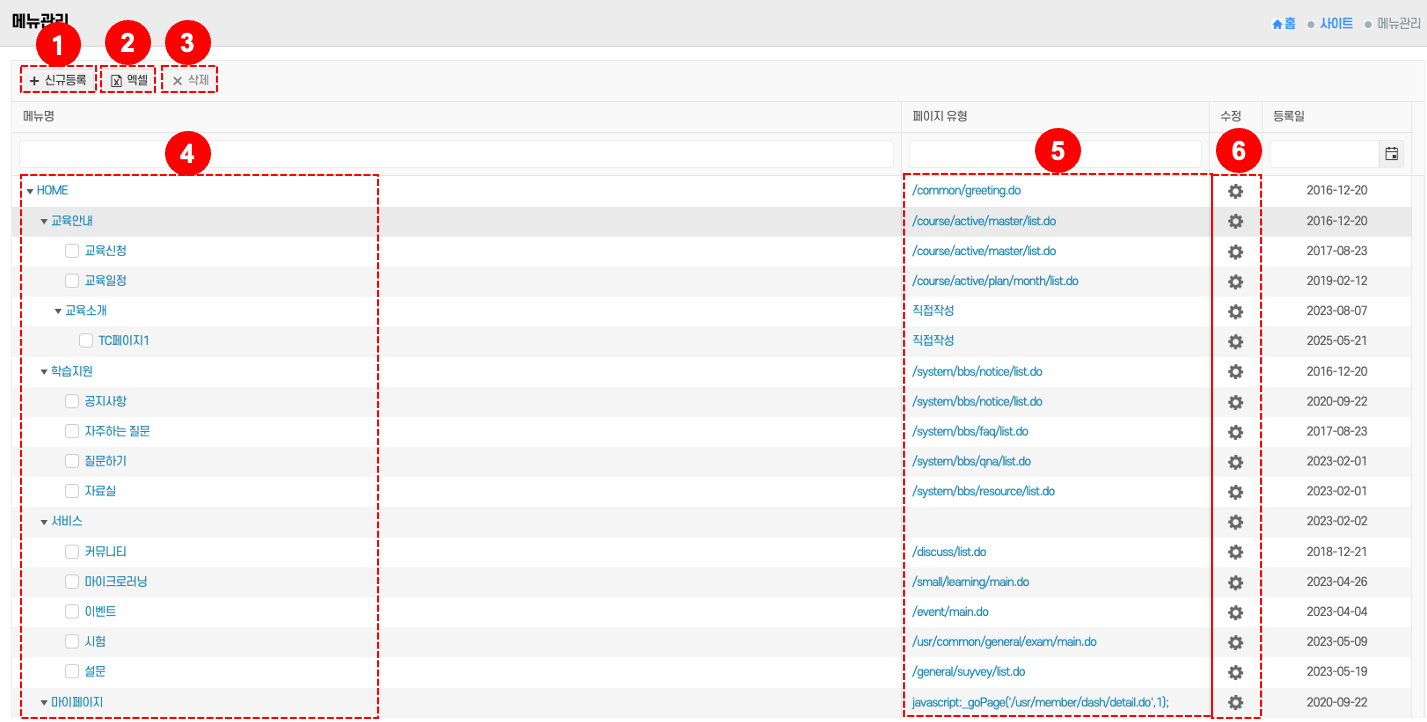 메뉴 구조 확인: 중앙의 메뉴 구조 ④를 확인 → 트리 형태로 상위/하위 메뉴를 관리한다.