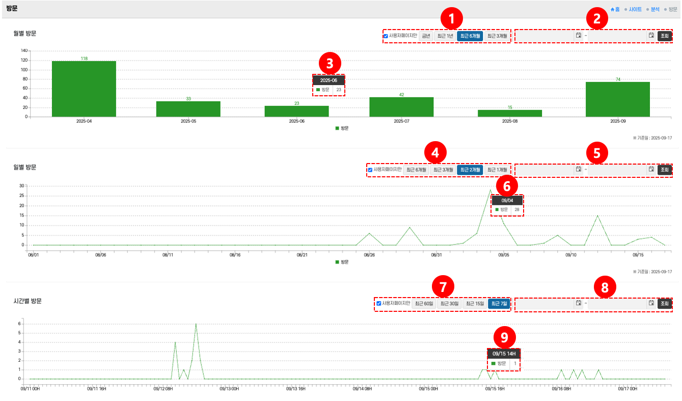 • 시간별 방문 확인: 하단의 기간 선택(⑦) 또는 기간 설정(⑧) 기능으로 기간을 설정하고, 특정 시간대의 **방문 수(⑨)**를 확인한다.