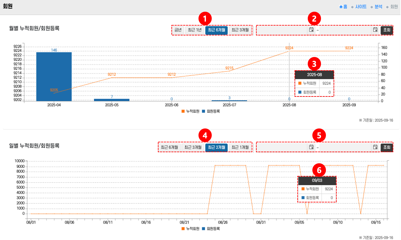 • 일별 통계 확인: 그래프의 데이터 포인트 ⑥을 확인 → 누적회원 및 회원등록 건수를 확인한다.