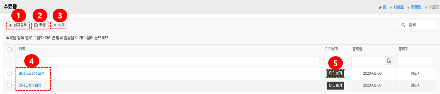 • 신규등록: 상단의 신규등록 버튼 ①을 클릭 → 새로운 수료증을 등록한다.