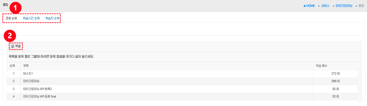 - 탭: 상단의 조회수 / 학습시간 / 학습자 수 중 원하는 탭 ①을 클릭하면 해당 페이지로 전환된다.
